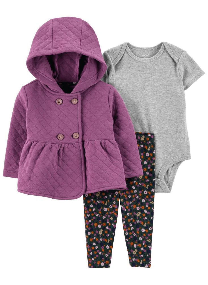 Diseñado con tres piezas en una, este conjunto se completa con un chaleco con cremallera, un body de manga larga y un par de pantalones fáciles de poner para una apariencia súper linda.