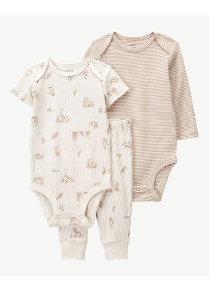 Diseñado con tres piezas en una, este conjunto se completa con un chaleco con cremallera, un body de manga larga y un par de pantalones fáciles de poner para una apariencia súper linda.
