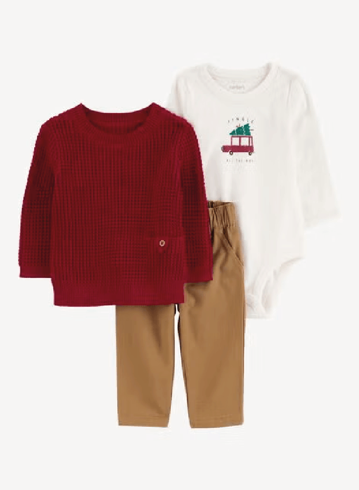 Diseñado con tres piezas en una, este conjunto se completa con un chaleco con cremallera, un body de manga larga y un par de pantalones fáciles de poner para una apariencia súper linda.