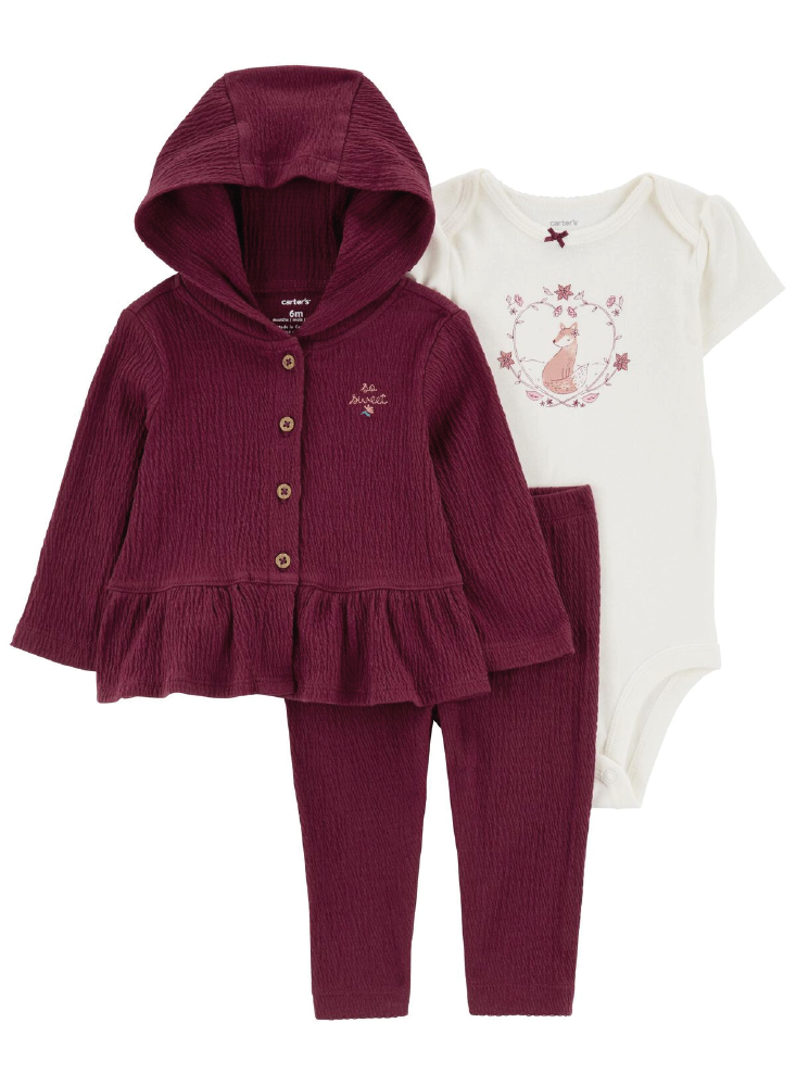 - Cárdigan y pantalón: punto arrugado 57 % algodón, 41 % poliéster, 2 % elastano