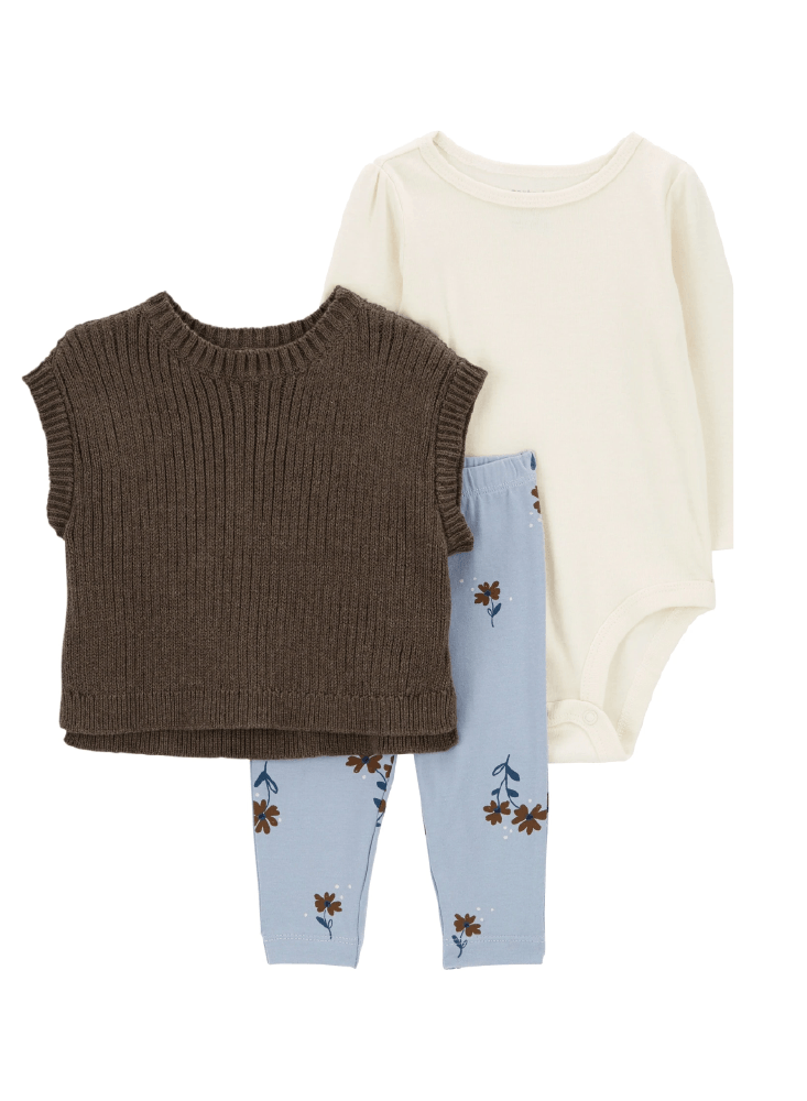 Aquí tienes un elegante conjunto para la pequeña que te encantará repetir una y otra vez. El adorable chaleco marrón le da un aspecto de niña grande mientras ella se mantiene cómoda y linda con la cintura elástica floral y el body de manga larga.