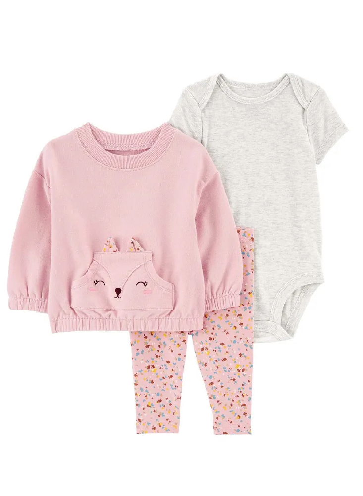 Diseñado con tres piezas en una, este conjunto se completa con un chaleco con cremallera, un body de manga larga y un par de pantalones fáciles de poner para una apariencia súper linda.