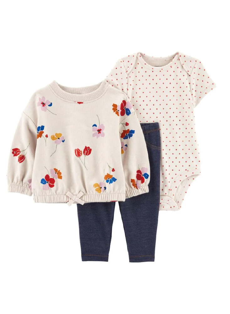 Diseñado con tres piezas en una, este conjunto se completa con un chaleco con cremallera, un body de manga larga y un par de pantalones fáciles de poner para una apariencia súper linda.