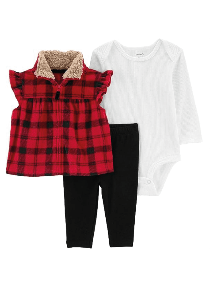 Diseñado con tres piezas en una, este conjunto se completa con un chaleco con cremallera, un body de manga larga y un par de pantalones fáciles de poner para una apariencia súper linda.