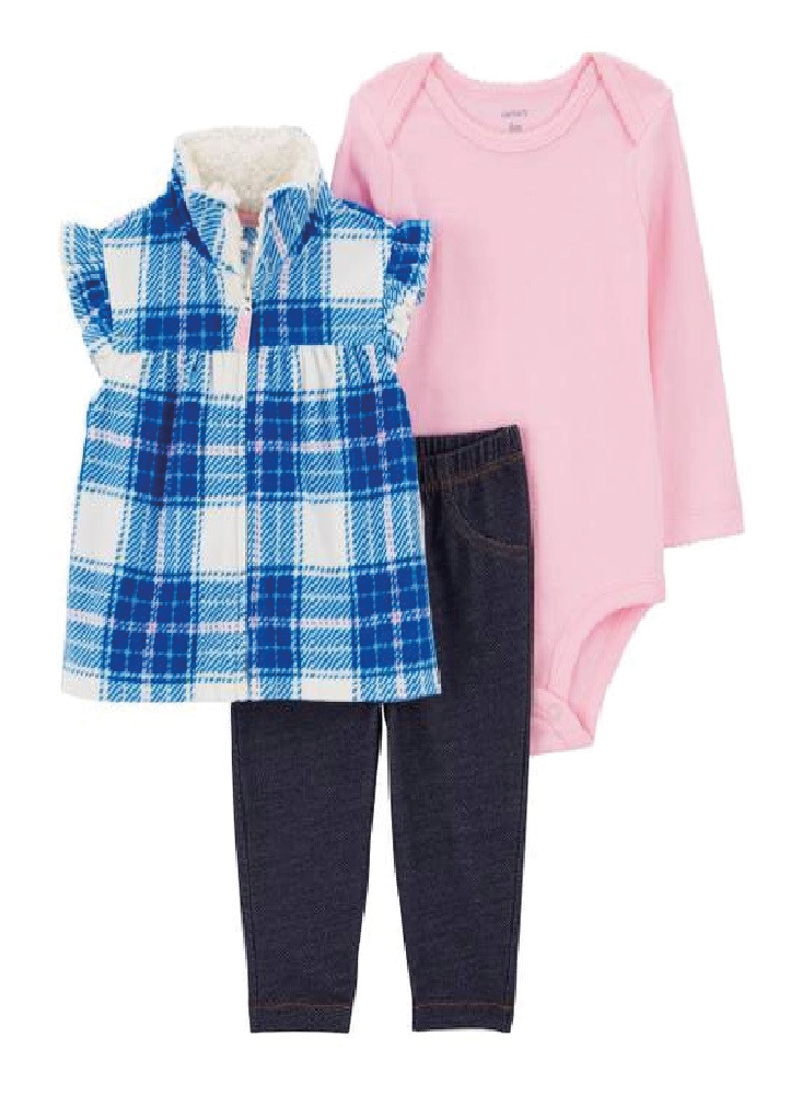 Diseñado con tres piezas en una, este conjunto se completa con un chaleco con cremallera, un body de manga larga y un par de pantalones fáciles de poner para una apariencia súper linda.