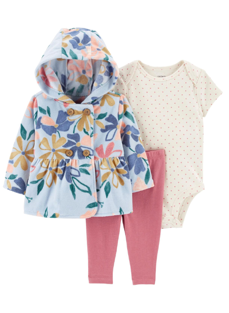 Diseñado con tres piezas en una, este conjunto se completa con un chaleco con cremallera, un body de manga larga y un par de pantalones fáciles de poner para una apariencia súper linda.