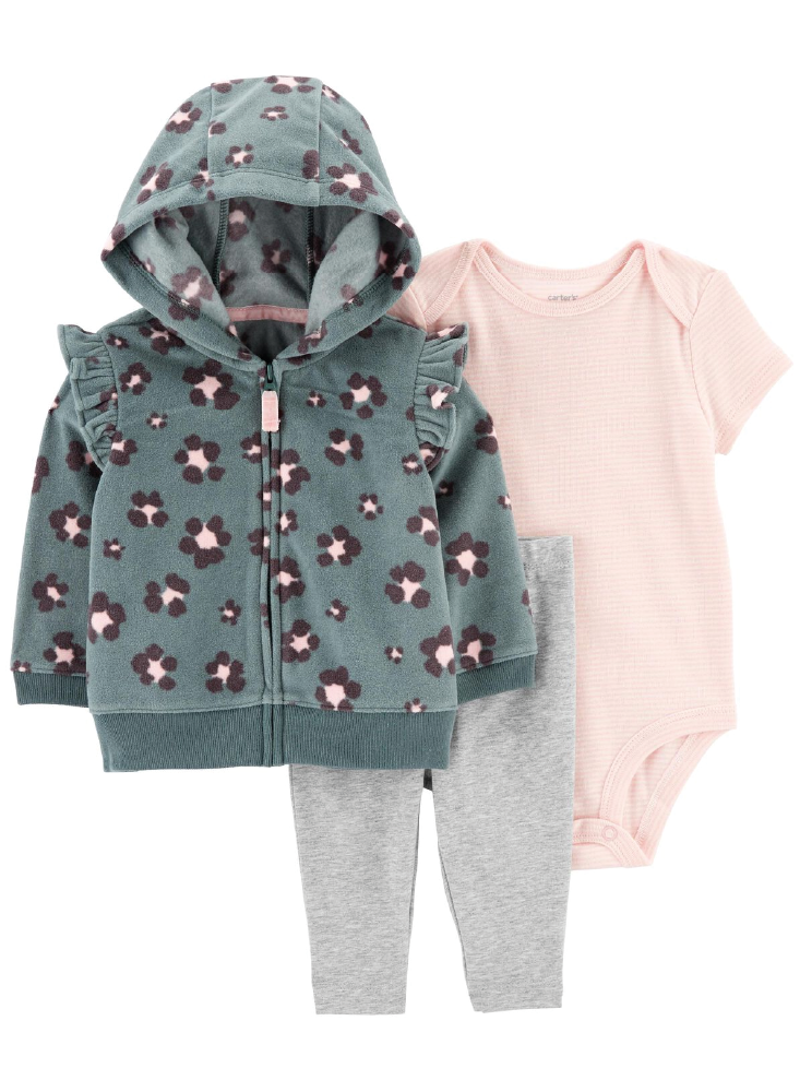 Diseñado con tres piezas en una, este conjunto se completa con un chaleco con cremallera, un body de manga larga y un par de pantalones fáciles de poner para una apariencia súper linda.