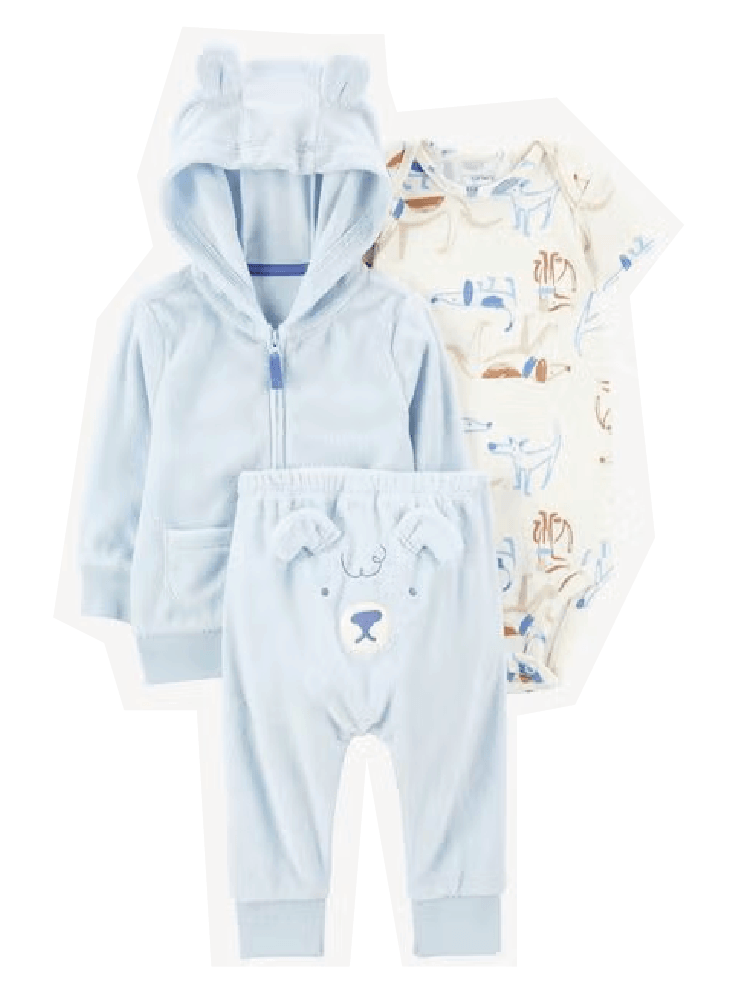 Diseñado con tres piezas en una, este conjunto se completa con un chaleco con cremallera, un body de manga larga y un par de pantalones fáciles de poner para una apariencia súper linda.