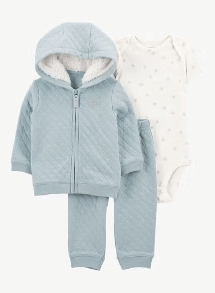 Diseñado con tres piezas en una, este conjunto se completa con un chaleco con cremallera, un body de manga larga y un par de pantalones fáciles de poner para una apariencia súper linda.