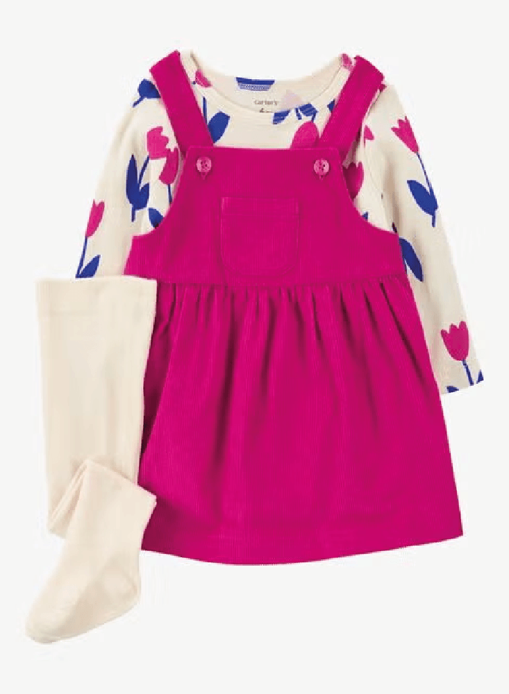¡Súper lindo y femenino, este conjunto incluye un lindo jersey de pana, una camiseta de manga larga y medias para completar el look!
